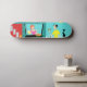 Willkommen in Suburbia! Dieses Retro Samstagvormittag Skateboard besticht durch ein attraktives, minimalistisches Cartoon-Paar in der kleinen Ecke des Paradieses. Aus dem Fenster eines türkisfarbenen und aquamarinen Ziegelhauses sehen wir Frau Homemaker. Die schöne Rothöhe trägt einen heißen rosa Fröck. Sie hält einen Krug frisch gepresster Limonade in einer Hand. Auf dem Fensterbrett vor ihr gibt es eine Rohrleitung heiß, hausgemacht, Gitterbettdecke, Obstkuchen in einem grünen Kuchen Teller. Auf dem Weg, vor der roten Tür zur Zuhause, wird die am Samstag vormittag aufgerollte Zeitung gewartet, um gelesen zu werden. Herr Mann des Hauses ist auf dem üppig grünen Rasen stehend. Er trägt eine blaue Hose und ein gelbes Shirt, das zu der sonnigen Haltung seiner Ehefrau passt. Er ist hinter einem roten Rasenmäher stehend. Wir können sehen, dass er bereits einen Grasstreifen gemäht hat, aber an diesem Punkt ist es schwer zu sagen, ob er hart arbeitet oder kaum arbeitet. Der Mähen scheint still zu sein, während er ein wackeliges Glas Limonade genießt. Ah, erfrischend! Neben dem Haus steht der Familienfeline auf einem weißen Zaun. Snowball, die ironisch schwarze Katze, schaut auf ihre treuen Subjekte und die orangen und gelben Blumen, die die Zaunreihe umranden. Die gelbe Sonne pinkelt hinter flauschigen, hellblauen Wolken. Der Himmel ist der Schatten des Wassers für Heimat, USA in kitschigen, modernen Kunstwerken Mitte des Jahrhunderts reserviert. Diese machen es lustig, Adresskarten zu wechseln oder Party Einladungen zu häuslichen Zwecken zu benutzen.