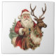 Keramik Kachel mit einer lustigen Weihnachtsillustrierung. Der Weihnachtsmann in seinem traditionellen roten Anzug reitet auf einem großen, mit Heiligen dekorierten Rentier. Ein Weihnachtsbaum hinten.