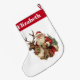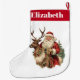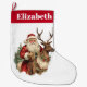 Weihnachts-Strumpf personalisiert mit einem Namen. Entworfen mit einer lustigen Weihnachtsillustrierung. Der Weihnachtsmann in seinem traditionellen roten Anzug reitet auf einem großen, mit Heiligen dekorierten Rentier. Ein Weihnachtsbaum hinten.