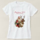Weihnachts-T - Shirt mit einer lustigen Weihnachtsillustrierung. Der Weihnachtsmann in seinem traditionellen roten Anzug reitet auf einem großen, mit Heiligen dekorierten Rentier. Ein Weihnachtsbaum hinten.