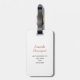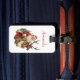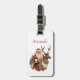Ein Gepäckanhänger mit einer lustigen Weihnachtsillustrierung. Der Weihnachtsmann in seinem traditionellen roten Anzug reitet auf einem großen, mit Heiligen dekorierten Rentier. Ein Weihnachtsbaum hinten.