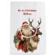 Geschenktüte mit einer lustigen Weihnachtsillustrierung. Der Weihnachtsmann in seinem traditionellen roten Anzug reitet auf einem großen, mit Heiligen dekorierten Rentier. Ein Weihnachtsbaum hinten.