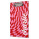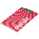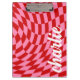 Die Zwischenablage mit rosa und roten, verdrehten Schachbrettmustern und Ihrem Namen in einem weißen Retro-Schriftart.