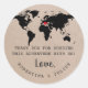 Tan Kraftpapier Hintergrund mit einer Weltkarte danke Ihnen Label für eine Hochzeit in Urlaubsort oder Reise-Thema-Party Gunstgeschenke oder Begrüßungstaschen - danke für Ihre Gäste für die Reise zu Ihrem Abenteuer Hochzeit, Party, oder Mitzvah zu feiern! ・ ・ ・ ・ ・ ・ ・ Klicken Sie auf ANKUNFTEN, um die Hintergrundfarbe, die Schriftart, die Textfarbe und das Layout des Aufklebers zu ändern, und verschieben Sie die Herzposition auf der Karte. ・ ・ ・ ・ ・ ・