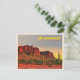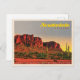 Vintages, helles Postkartendesign mit roten Felsgebirgen und saguaro cacti gegen einen wilden Westsonnenuntergang