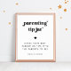 Ermuntern Sie Ihre Gäste, ihre besten Erziehungstipps mit diesem eleganten Plakatzeichen verlassen, das Retro-Skript und bearbeitbaren Text enthält. Fügen Sie einfach Ihren eigenen Text hinzu, indem Sie auf "Personalisieren" klicken.