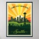 A stylized, vintage-inspired illustration of the Seattle skyline featuring the Space Needle and city buildings against a sunset sky.
