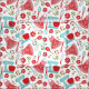 Vintages Themenmuster mit Schürze, Mixern, Küchenutensilien und Blume in Rosa, Rot und Blau. Ideal für Shabby Chic Küchenprojekte.