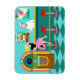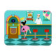 Servieren Sie etwas Besonderes mit diesem Retro Soda Fountain Flexible Magnet. Die minimalistische Kunst, der Cartoon zeichnend Design kennzeichnet das Interieur des coolsten Ortes in der Stadt. Es ist ein Sodabrunnen aus den 50er Jahren, ganz in der kitschigen Pracht! Vor dem Hintergrund einer Wassermauer sehen wir Plakate, auf denen die Spezialitäten des Hauses gepriesen werden. Ein Poster zeigt einen Hamburger und eine Flasche Pop zum Schnäppchenpreis von 15 Cent. Das andere Poster zeigt zwei Bruchstücke Eis in einer Zuckerdose für nur 5 Cent. Bei Preisen wie diesen muss es schwierig sein, Ihre Taille zu sehen! Ein kompetenter Soda-Jerk ist die Besetzung der aquamarinen Theke mit gelben Akzenten. Der junge Mann mit der ausgeprägten Arbeitsethik hält eine Eistüte mit einem Single aus Zitronengelb-Eis - obwohl es, um fair zu sein, Ananas sein könnte! Die geputzte Platte trägt ein unberührtes, weißes Shirt mit einer schwarzen, bogenförmigen Krawatte und einem weißen Hut mit roten Akzenten. Auf der anderen Seite der Theke sehen wir drei rote und chrome Bar. Auf einem der Hocker sitzt ein blonder Teenybopper, dessen Mund sicherlich gießt. Es ist unklar, ob ihr Mund über die Eiskegel gießt, auf der sie sich zubewegt, oder den fleißigen jungen Mann, der sie serviert. Sie trägt einen rosa Poodle-Rock und einen schwarzen Teller mit passender Form. Ihre gelben Schlösser werden in einem klassischen Pferdeschwanz zurückgezogen. Neben dieser Süsse eines Kunden befindet sich eine farbenfrohe, klassische Jukebox mit braunem Holzkorn, Holztäfelungen und farbenfrohen Neonleuchten. Besser als das, es ist sicher, alle besten Rock-and-Roll-Hits der Zeit zu bieten! Der Boden dieser modernen Eisdiele aus der Mitte des Jahrhunderts ist ein Aqua-und aquamarines Schachbrettmuster, das nur nach jemandem schreit, der die neuesten Tanzbewegungen ausprobiert.