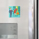 Schatz, ich bin Zuhause! Dieser Retro Space Age Cartoon Couple Magnet wird Sie Gefühl neidisch auf das Cartoon Paar auf einem Magneten! Das Design ist mit einem türkisfarbenen Hintergrund mit aquamarinen Ziegelsteinen und einem Olivgrün mit Kamin ausgestattet. Es gibt eine aquamarine Sternexplosion-Wanduhr und eine zweistöckige Pendelleuchte in Gelb-, Blau- und Schwarztönen. Vorder- und Mittelklassehotel, in blauer Anzug und orangefarbener Krawatte, ist ein hervorragender Geschäftsmann. An seiner Seite trägt seine blonde Bombshell einer trophischen Ehefrau ein rotes Kampfkleid und hält ein Tablett mit Martinis. Va-va-va-voom!