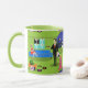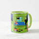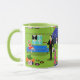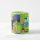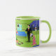 Diese Retro städtische Weihnachtspaar-Tasse kennzeichnet das Cartoonzeichnen einer eleganten Penthousewohnung, die ganz für die Feiertage mit den Strängen der bunten Weihnachtslichter und kitschy verziert wird, rosa, Weihnachtsbaum, schließt mit aquamarinen Verzierungen und einem gelben Stern ab. Die Wohnung kennzeichnet einen grünen Boden und eine grüne Backsteinmauer. Auf der Wand sind der vier Klassiker-Film Martini die ausgedehnten Leinwand-Drucke, auch verfügbar von StrangeLittleOnions Zazzle Speicher (Andeutung, Andeutung!). Drei der Drucke kennzeichnen Türkishintergründe und man ist auf einem schwarzen Hintergrund. Unter den Leinwanddrucken ist ein Blau, modernes Sofa der Mitte des Jahrhunderts. Eine hoch entwickelte, Rabe-haarige Schönheit sitzt auf dem Sofa. Sie trägt ein vibrierendes, rotes Kleid und eine Weihnachtsmannmütze. In einer Hand hält sie einen Sprig des Mistelzweiges gebunden mit einem roten Bogen. Auf der gegenüberliegenden Seite des Raumes gibt es ein höfliches, hoch, ein dunkel und gutaussehender Mann. Er trägt einen schwarzen Anzug, ein weißes Shirt und eine rote Krawatte. In einer Hand hält er ein VinylRekordalbum, und, in der anderen Hand, hält er eine Spaßalbumabdeckung. Auf dem Boden gibt es orange Osmane, die einen grünen und schwarzen Rekordspieler halten. Gegen die Osmane Propped eine andere Albumabdeckung mit einem Rekordrollen aus der Seite heraus. Es gibt auch drei bunte Vinylalben, die über den Boden zerstreut werden. Hinter dem Mann können wir, durch Glasschiebetüren, den Schnee, der auf einen grünen Balkon fallen und die Stadt unten sehen. Eine weiße Katze, die einen roten Bogen um seinen Hals trägt, wird am Rand des Balkons gehockt. Über der Katze hinaus gibt es atemberaubenden Stadt-Skyline, die mit Wolkenkratzern und einem gelben sichelförmigen Mond komplett sind. Wenn dieses ist, wie die anderen Halbwertzeiten, mich sich anmelden!