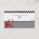 Eine Visitenkarte für den Caterer, den privaten Koch oder jeden in der Gastronomie. Vorderseite mit einem Retro-Ofen mit einem roten Topf auf der Vorderseite. Das Stove befindet sich auf einem schwarz-weißen Boden. Der Hintergrund unten ist grau in Schwarz mit roten Blume umrahmt. Personalisieren Sie mit Ihrem Namen und Titel. Personalisieren Sie die Rückseite mit Ihren Kontaktinformationen.