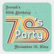 Party-Sticker aus den 70er Jahren mit Retrostil-Typografie des '70er-Party'. Die Designs umfassen 70 inspirierte Elemente wie Blau, Orange, Senfgelb, Dunkelrot und Braun, Streifen und Vintage Textur. Enthält eine Vorlage, die persönlich an Ereignis und Datum angepasst werden kann.