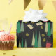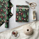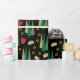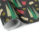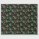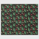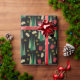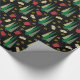 Dieses Geschenkpapier zeigt ein Weihnachtsmuster mit einem Retrostil-Look, bestehend aus Weihnachtsbäumen, Geschenken und goldenen Wirbel in abgestuften Grüntönen, dunkelrot und goldfarben auf schwarzem Hintergrund.