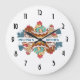 A personalized kitchen clock with a bunch of delicious looking cupcakes with swirls and cherries and yummy frosting. Illustrated in hat einen Retro-Stil. Colors inklude retro green, red, blue and cream.