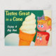 Postkarte im Retrostil des Nationaleiskremtages. Der Nationale Eiskremstag wird dank Ronald Reagan im Jahr 1984 zum dritten Sonntag im Juli gefeiert. Hochwertiges, individuell restauriertes Vintage-Image.