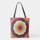 Dieses Bild zeichnet sich durch eine lebendige, abstrakte Spirale aus geschichteten, gezackten Farbbändern aus, die vom Zentrum nach außen strahlen. Das Design verwendet eine Retropalette aus Bordeaux, Orange, Gelb, Creme und Maron, wodurch ein Gefühl für dynamische Bewegung entsteht, das an ein Kaleidoskop oder einen stilisierten Wirbel erinnert. Die schrägen Kanten und die sich verändernden Farbbänder verleihen ihm eine energetische, hypnotische Qualität, die es optisch ansprechend und modern macht.