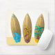 Drei Surfbretter aus Retro-Holz, die auf dem Sand stehend sind. Die Surfbretter sind mit blauen Wellen, Delphinen und Palmen gestaltet. Dieses Design ist cool, angesagt und perfekt für die Liebhaber des Strandes, des Sommers und des Surflebens.