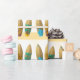 Ein Entwurf von drei retro hölzernen Surfbrettern stehend zusammen auf dem Sand. Die Surfbrettentwürfe umfassen blaue Wellen, Delphine und Palmen. Dieser Entwurf ist cool perfekt, angesagt und für Liebhaber des Strandes, des Sommers und des Brandungslebensstils.