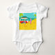 Jeden Tag kann ein Tag am Strand mit diesem Retro Surfer Couple Säugling Strampler sein. Das minimalistische Kunstdesign der 60er Jahre bietet ein lustiges, sonnenverwöhnendes und spannendes Paar, das bereit ist, eine Welle zu fangen. Die Umgebung ist eine tropische Insel-Oase mit einem goldenen Sand, schwingenden, grünen Palmen, einem glitzernden, pfauenblauen Ozean und einem Wasserhimmel. In der Ferne sieht man eine aquamarine Vulkaninsel, die vorerst ruhend ist. Zurück am Strand, können wir nicht umhin festzustellen, die süße Fahrt, die unser Paar zu ihrem Traumziel gebracht hat. Es handelt sich um einen modernen, roten und weißen Van mit einem orangen und gelben Surfbrett, der an der Spitze befestigt ist. Obwohl wir uns nicht sicher sein können, ist es doch recht gut anzunehmen, dass das Innere des Van mit groovigem Teppichboden und dem Geruch nach Weihrauch ausgestattet ist! Surfer Typ und Beach Babe haben passende sonnengeblasene Tans, sonnengebleichtes Haar und blaue, tiki gemusterte Badeanzüge. Surfer Typ hält ein blaues Surfboard. Beach Babe ist stehend neben ihrem zweifarbigen, rosa Surfbrett. In der Nähe befindet sich ein roter und weißer Beach-Ball, der gewartet ist, sein Sommerziel zu erfüllen. Fangen Sie ein paar Wellen und teilen Sie Liebe mit diesem kitschigen Sommerdesign!