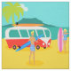 Jeder Tag kann ein Tag am Strand mit diesem Retro Surfer-Paar-Gewebe sein. Die Sechzigerjahre Art, unbedeutende KunstAusrüstungsbeschreibungen ein lebenslustiges, sonnen die Anbetung, das suchende Paar der Erregung, das ganz bereit ist, eine Welle zu fangen. Die Einstellung ist eine tropische, Inseloase mit einem Strand des goldenen Sandes, ein Beeinflussen, grünen Palmen, ein Funkeln, Pfaublauozean und ein Aquahimmel. Im Abstand können wir eine aquamarine vulkanische Insel sehen, die vorläufig schlafend ist. Zurück auf dem Strand, können wir nicht die, süße Fahrt zu bemerken helfen, die unsere Paare zu ihrem Traumbestimmungsort holte. Es ist ein moderner, roter und weißer Packwagen der Mitte des Jahrhunderts mit einem orange und gelben Surfbrett, das zur Spitze gegurtet wird. Obwohl wir nicht sicher sein können, ist es angemessen, anzunehmen, dass das Innere des Packwagens starkes kennzeichnet, Noppeauslegen mit teppich und der Geruch des Weihrauchs! Surfer-Typ und das Strand-Baby haben das Zusammenbringen Sonne-geküsst sich bräunt, Sonne-gebleichtes Haar und Blau, tiki gemusterte Badeanzüge. Surfer-Typ hält ein blaues Surfbrett. Strand-Baby ist neben ihr zwei-tonte, rosa Surfbrett stehend. In der Nähe liegen, gibt es ein Rotes und weißer Wasserball, wartete, um sein Sommerschicksal zu erfüllen. Fangen Sie einige Wellen und teilen Sie irgendeine Liebe mit diesem kitschy Sommerentwurf!