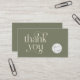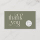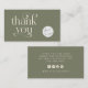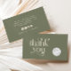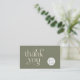 Einfache Beipackkarte für kleine Unternehmen mit einem Wirblen Retrotext, der "Danke" sagt. Sie können Ihr Logo und eine einfache Nachricht auf der Rückseite zusammen mit Ihren sozialen Medien und Website-Informationen hinzufügen. Die Farbe ist in Salbei grün.