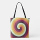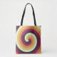 Dieses Bild zeichnet sich durch ein gewagtes, farbenfrohes Spiralmuster aus abwechselnden Bändern warmer, retro inspiriert Farben aus, darunter tiefer Maron, Orange, Gelb und Hellcreme. Das Design ist geometrisch, lebendig und visuell hypnotisch und erzeugt ein dynamisches Bewegungsgefühl, das das Auge in Richtung der Spiralmitte zeichne