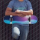 Retro synthwave glühende Neonlichtlandschaft 1980 Skateboard