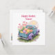 This heartwarming watercolor design features a retro two-tone pickup truck in teal blue and soft purple, driving away into a sunny spring day. The truck bed is overflowing with giant, colorful Easter eggs and blooming pink flowers, capturing the pure joy of the holiday.