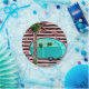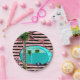 Rosa und Schwarzes striped Hintergrund mit Palme und Türkis Teardropcamper