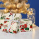 This vintage-style holiday pattern features a repeating grid of whimsical figures tucked into green Christmas stockings on a light, creamy-yellow background. The figures alternate between what appears to be a small hedgehog or similar spiky animal and a round-faced, grinning person, both wearing Santa hats and red outfits. Some of the stockings have a solid green color, while others are patterned with stripes or polka dots; accessories vary as well, with some figures holding small Christmas trees, red stars or ornaments, creating a cheerful, mid-century modern aesthetic.