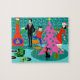 Diese Retro Familie Trimmt das Weihnachtsbaumpuzzle enthält jede Urlaubstradition außer dem Fruitcake. Die Cartoon-Familie aus den 60er Jahren befindet sich in ihrem modernen Wohnzimmer im Zentrum des Jahrhunderts in Zuhause. Es gibt eine türkisfarbene und aquamarine Ziegelmauer und einen roten Kamin mit Kamin und einem Kaminfeuer. Vater trägt einen schwarzen Anzug und eine rote Krawatte. Er hängt grüne Weihnachtsfeiertage mit Vorsicht an den Mod-Kamin. Neben dem Vater ist Junior auf einem orangefarbenen Stuhl unsicher. Wow! Leicht da, Junior! Er reicht aus, um ein Ornament auf einen kitschigen, rosa, Weihnachtsbaum zu legen, der bereits mit aquamarinen Ornamenten und einem gelben Stern bedeckt ist. Auf der anderen Seite des Baumes hält die Mama ein festlich umhülltes Geschenk. Hey, kein Schütteln erlaubt! Mama trägt ein helles, rotes Kratzerkleid mit weißem Trimm. Sie trägt auch eine Weihnachtsmannmütze. Unter dem Baum befindet sich eine schwarze, schwarze Katze, die einen roten Bogen trägt. Auf dem Boden befindet sich ein grün-schwarzer Schallplattenspieler, umgeben von bunten Vinyl-Alben. Sie wissen nur, dass die Familie mit ihren liebsten Weihnachtsliedern gesungen ist, während sie die Hallen betreten.