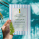 Starten Sie Ihre Feier stilvoll mit dieser Retro-Tropen-Probe-Dinner-Einladung. Mit klassischen blauen Streifen, einer fröhlichen Ananas und üppigen Palmwedeln kombiniert dieses Design charmant-vintage Elemente mit frischer tropischer Atmosphäre. Perfekt für Strand-, Ziel- oder Sommerhochzeiten, schafft es einen entspannten, aber stilvollen Rahmen, um Freunde und Familie vor dem großen Tag zu versammeln. Vollständig anpassbar an Ihre Veranstaltungsdetails.