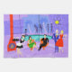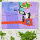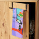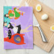 Dieses Retro Tropical Cocktail Party Küchentuch ist im Detail berauschend. Das Design des Cartoon besticht durch ein ausgeklügeltes Cocktail-Party, das normalerweise nur in Filmen aus den 1960er Jahren zu sehen ist. Ein modernes Wohnzimmer aus der Mitte des Jahrhunderts ist mit Partygästen gefüllt, die die geschmackvolle, lila Dekoration genießen. Eine hübsche Frau in der Uniform einer französischen Magd trägt ein Tablett mit Martinis. Sie ist neben einem roten Kamin mit Kamin und einem rauschenden Feuer stehend. In der Mitte des Raumes befindet sich ein schönes Paar, das sich in orangefarbenen Eierstühlen niederlässt. Die Frau trägt ein helles, grünes Kleid. Der Mann trägt einen schwarzen Anzug mit einer roten Krawatte. Sie halten jeweils einen Martini. Ein weiteres Paar sitzt unter einem zarten, gelben Sputnik-Kronleuchter. Der angesehene, weißhaarige Gentleman trägt einen blauen Anzug, hellblaues Shirt und rote Krawatte. Er hält auch einen Martini in jeder Hand und zeigt der Welt, dass seine Feiertage noch lange nicht vorbei sind. Sein Begleiter ist eine formschöne Blondine in einem atemberaubenden roten Kleid. Hinter dieser Szene können wir durch die Glaswände von Boden bis Decke sehen. Im Außenbereich befindet sich ein runder, türkisfarbener Swimmingpool. Wir können die lila Silhouette einer Frau sehen, die ihre Beine ins Wasser taucht. Zwischen lila Steinmauern gibt es Silhouetten von Palmen. Auch die Silhouetten der Tanz- und Gesprächspartner sind sichtbar. Wenn es eine Sache gibt, die das beweist, ist es, dass Menschen, die in Glashäusern leben, zwar keine Steine werfen sollten, aber auf jeden Fall Partys werfen sollten!