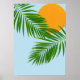 Dieses Poster zeichnet sich durch ein elegantes minimalistisches Design mit einer tropischen Sonne hinter Palmen Blätter auf blauem Himmelshintergrund aus.