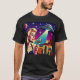 Young woman holds a magnifying glass with a flower inside, gazing towards a flying saucer emitting a beam of light. The background is a surreal desert landscape with cacti, mountains, and a bench under a starry sky with planets.
