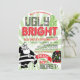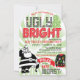 Personalisieren Sie diese Retro & lustige rot, grün & weiß Ugly Sweater Weihnachtsweih-Party Einladung, in einer trendigen Bogen-Form, mit einem niedlich verwelkten schwarz-weiß Vintagen Weihnachtsmann, marquee Lichter und Pullover Typografie, die sagt: "Mögen alle Ihre Sweaters UGLY & Bright"! Einfach die Formulierung anpassen, um es zu Ihrem eigenen, von den Fig und Lily Studios liebevoll gestalteten Design zu machen