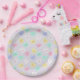 Diese niedlichen Party-Teller sind im Retrostil zum Valentinstag gehalten. Der Hintergrund ist ein lila Papiermuster, das sich durch die Laibe zieht. Pastellfarbene Valentinherzen werden mit verschiedenen Redewendungen, Botschaften und Lieben abgebildet.