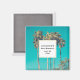 Event-Magnet mit einem schönen Foto. Große Palmen mit langen schmalen Stämmen vor einem schönen grünen Himmel. Retro-Farbschema. Entspannen und kühlen.
