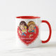 Diese niedliche Kaffee-Tasse zeigt eine Retro-Abbildung eines Jungen und Mädchens in einem großen roten Herz am Telefon mit der Überschrift "Ich habe die richtige NUMBER Valentine Got - Es ist YOU!"