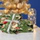 This vintage style Christmas wrapping paper evokes a sense of nostalgia and charm, featuring classic designs that harken back to a bygone era. Featuring classic retro text, ornaments, Christmas trees, and holly berries. The overall appearance looks aged in a good way.