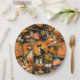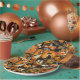 Dieses Halloween-Packpapier-Muster hat ein Vintages Retro-inspiriert Thema. Das Design besticht durch eine Collage klassischer Halloween-Elemente in lebhaften Orange-, Schwarz- und Goldtönen. Wichtige Bilder beinhalten eine schlanke schwarze Katze mit schelhafter Ausdrucksweise, grinsende Jack-o'-Laternen und elegante Hexen in fließenden Kronen. Es gibt auch Spuk Häuser, spukhafte Geister-Sprichwort "Boo!", tanzende Skelette und herbstliche Blume, die alle durch glänzende Goldakzente ergänzt werden. Der Hintergrund wechselt zwischen dunklem Himmel, Sternenhimmel und hellorangen Feldern und schafft eine festliche und etwas unheimliche Atmosphäre. Dieses Muster erinnert an einen verspielten und nostalgischen Halloween-Geist, der perfekt zum Verpacken von Geschenken oder für den Urlaub dekoriert ist.