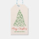 Wenn Sie ein einzigartiges und schön leicht bearbeitbares Weihnachtsgeschenk-Tag suchen. Dieses hier ist perfekt für dich. Wie Sie sehen, das Design verfügt über eine einzigartige grüne Hand gemacht und gezeichnet Weihnachtsbaum aus Bändern. Mit rot handgeschriebener Typografie von frohen Weihnachten und handgeschriebenen Familiennamen in grün.