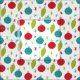 Mit diesem gemusterten Stoff können Sie festliche Geschenke, Dekoration und mehr erschaffen. Es zeigt einfache Illustrationen von Retro-Weihnachtsschmuck in leuchtend rot, türkisblau und limig grün sowie die Koordination von Sternen oder Sternen-Formen vor weißem Hintergrund. Die Grafiken haben einen leicht bedrückten Stil für ein Vintages Aussehen.