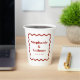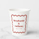 Mit diesem Retro 1950er Wavy Edge Dark Red Hochzeitspapier Tasse servieren Sie Ihre Hochzeitsgetränke im Vintagen Stil. Dieses Design mit einem knalligen, weißen Hintergrund, gerahmt von einem kühnen, dunkelroten Flügelrahmen, bringt zeitlose Eleganz in die Mitte des Jahrhunderts. Braut- und Bräutigam-Namen und Hochzeitstermin werden in einem koordinierenden dunkelroten Schriftart schön dargestellt, was eine persönliche und raffinierte Touch verleiht. Diese Retro-inspirierten Papiertassen eignen sich ideal für Hochzeitsfeiern, Cocktailstunden, Brautpartys oder Verlobungsfeiern und bieten Komfort und einen stilvollen Akzent für Ihren besonderen Tag.
