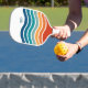 Ein farbenprächtiger sportlicher Look mit zeitloser Retro-Atmosphäre, dieses helle Muster aus gewellten Streifen in Rot, Orange, Türkis und Blau auf weißem Hintergrund lässt Sie auf dem Pickle Ball Court Ihr Bestes geben! Eine Textvorlage wird zur Personalisierung mit Ihren Monogramm-Initialen oder einem anderen gewünschten Text hinzugefügt.