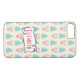 Eine stilvolle Retro-Handy-Hülle mit einem skurrilen, handgezeichneten Rahmen, in dem Ihr personalisierter Name in der Mitte steht. Das Hintergrunddesign ist ein festliches Weihnachtsmuster in cremefarbener Farbe. Illustrationen von pastellfarbenen, grün-blauen, Weihnachtsbäumen und pastellrosa Bausteine und Bögen in einem sich wiederholenden Muster.