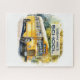 Ein Puzzle mit einem Bild eines Retro-Schulbusses und Text: Willkommen zurück zur Schule.