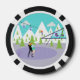 Dieses Retro Winter Ski Resort Poker Chip hat für jeden etwas. Der malerische Cartoon zeichne mit einer schneebedeckten Bergkette mit grünen Zedern. Ein einsamer Skifahrer, der rot, orange und königsblau trägt, kann den höchsten Berg hinabschwingen. Im türkisblauen Himmel fällt weiterhin Schnee von Wolken. Wir können die Silhouetten glücklicher Menschen sehen, die in Skiliftgondolen vorbeifliegen. Über den Bäumen steht ein modernes, hochgezogenes Skihütte aus der Mitte des Jahrhunderts. Durch die Glaswände können wir eine dunkelhaarige Schönheit sehen, die sich in einem hellen, lila Ei-Stuhl ruht. Sie trägt einen grünen Pullover, marineblaue Hosen und einen schwerfälligen weißen Guss auf einem Bein. Tut ihr nicht zu leid. Sie genießt die Wärme eines olivgrünen, konusförmigen Kamins mit einem rauschenden Feuer. Sie hat auch einen phantastischen Blick auf ein paar romantische Eis-Skater auf einer gefrorenen, lila Eisbahn. Der Mann des Duo trägt einen schwarzen Springanzug mit einem gelben Rollkragen. Seine Hände sind um die Taille seines Partners gewickelt. Sie ist eine wunderschöne Rotkopfröte, deren Haare in einem Pferdeschwanz stehen. Sie trägt ein eisblaues Oberteil und kurz, flauschig, seeschaum grüner Rock. Sie haben die Zeit ihres Lebens, aber hoffen wir, dass sie den Riss im Eis bemerken.