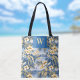 This tote bag feaetures a retro hibiscus flower, tropical palm trees, and blue pattern. It's reminiscent of classic Hawaii or Tahiti, almost like a tropical shirt pattern. Your monogram initial appears in yellow against a blue background in a colorblock at top, which has a simulated brushed metal look. This nostalgic beach style design might remind you of tropical beaches and relaxing waves whenever you see it.